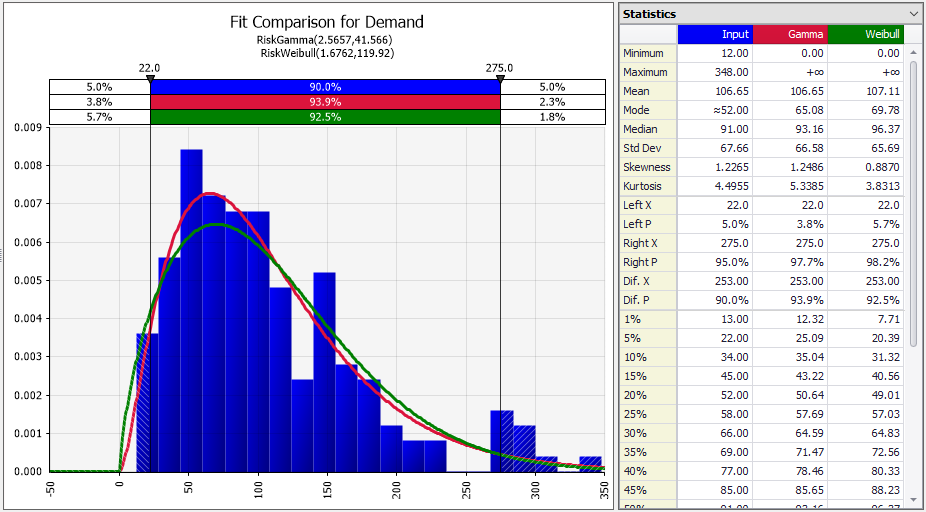 The Fit Comparison Graph (Figure 1, right) displays two curves when the Fit Results first opens - the distribution of the sample data and the best fit distribution as an overlay (based on the ranking method chosen - see Fit Ranking Methods). Additionally, the @RISK function (or functions) displayed in the comparison are detailed beneath the graph title, including the parameters. Lastly, the statistics for both the same data and the selected distribution are displayed in the Information Panel to the right of the graph.