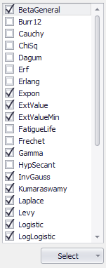 When selecting distributions to test for fitting, there are three configurations that control the list of available distributions; the Fit Data Types setting, the Lower Limit selection, and the Upper Limit selection. Use these three settings to filter the list of distributions to match the characteristics of the data set.