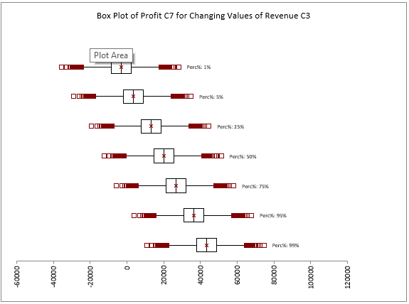 The Box-Whisker Plot option for Advanced Sensitivity Analysis generates a box plot graph (Figure 6, right) for the input at each of the "stepped" values used in the analysis. A box plot displays the summary of a set of data for five statistics - the minimum, first quartile, median, third quartile, and maximum. The box spans the first quartile to the third quartile and a vertical line marks the median.