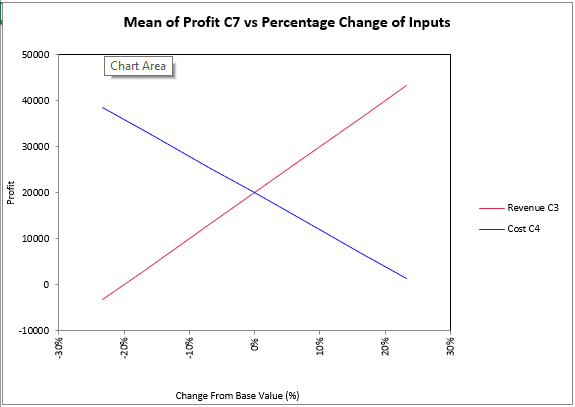 The Percent Change Graph (Figure 8, left) plots the output statistic against each of the selected inputs calculated as a Percent Change from Base. The input value, listed on the X-axis, is calculated by comparing each input value tested to the base value for the input.