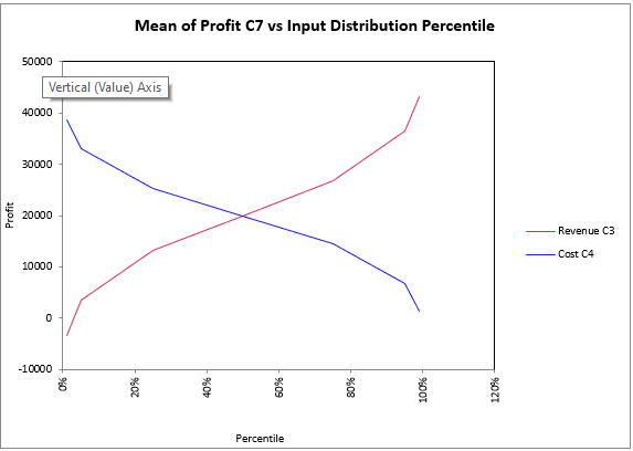 The Percentile Graph (Figure 7, right) plots the output statistic against percentiles of each of the @RISK distributions that were selected for analysis with step type Percentiles of Distribution.