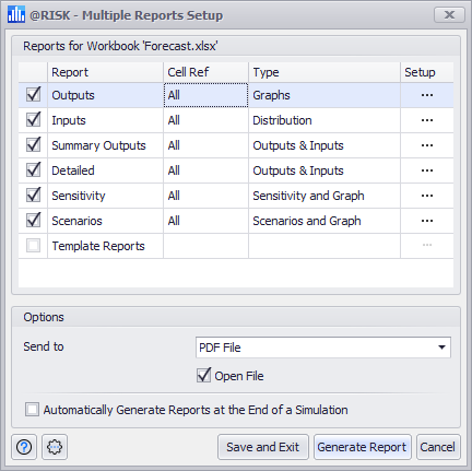 Save and Exit - Validates and saves the report settings in the dialog without actually creating a report.