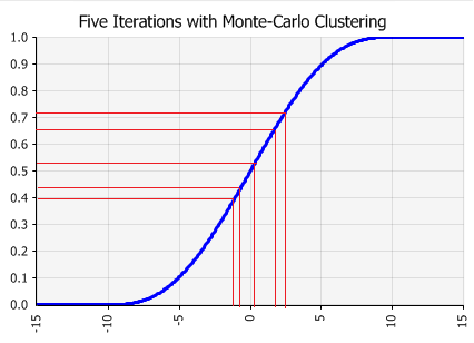 In the following graph, the Y axis has been divided into five intervals. During sampling, for every five draws, one of the draws will fall in each of the five intervals; they can’t cluster as in the Monte Carlo method. With Latin Hypercube, the samples are guaranteed to more accurately reflect the distribution of values in the input probability distribution.