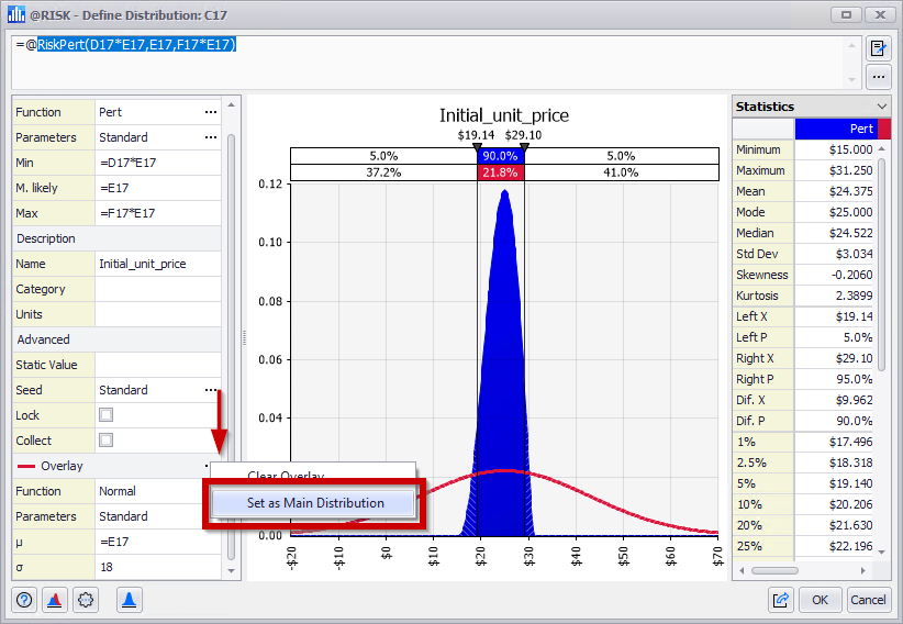 The Define Distribution window now allows for swapping overlay distributions with the original distribution, replacing the original @RISK function with the overlay's @RISK function. This enables quick comparison of input definitions and quick selection of the distribution that is most appropriate to the model.