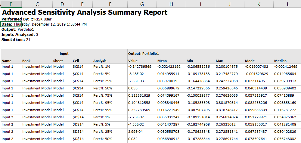 A Summary (Figure 2, below) describes the stressed inputs, and lists the corresponding statistics of the monitored output: Mean, Minimum, Maximum, Mode, Standard Deviation, Variance, Kurtosis, Skewness, 5th Percentile, and 95th Percentile.