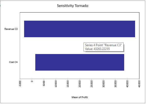 The Tornado Graph (Figure 9, right) shows a bar for each of the inputs defined for analysis, showing the minimum and maximum values of the specified output statistic as the input varies over its range.