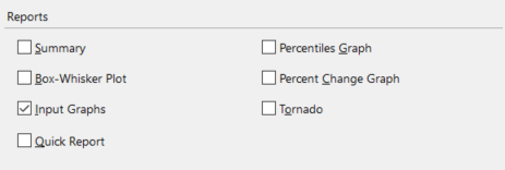 The reports available for an Advanced Sensitivity Analysis include a summary report, a quick report, and several types of graphs. Each of the report options detailed below correspond to an option available in the Advanced Sensitivity Analysis Options window, under the 'Reports' section (Figure 1, right). Below are details on the various types of reports that can be generated.