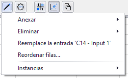 El botón Editar en la sección de botones de comando incluye varias opciones para trabajar con las entradas relacionadas con una correlación. Estas opciones incluyen añadir, sustituir o eliminar entradas, añadir filas en blanco a la matriz de correlación, reordenar las entradas dentro de la matriz de correlación y trabajar con instancias.