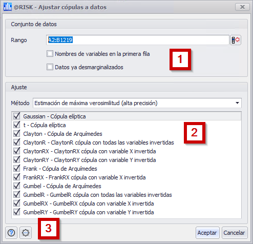 Configuraciones/acciones - Ventana - acciones y configuraciones específicas. Las opciones de Ajustar cópulas a datos son:
