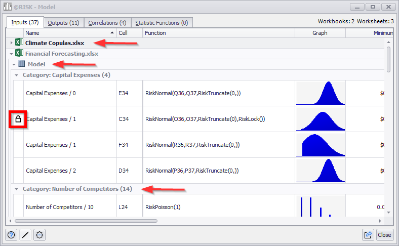 Please note: when multiple @RISK workbooks are open, the Model Window displays the @RISK elements from every open workbook, and any worksheet that includes an @RISK element. By default, the elements from a given file will be listed under a collapsible header that includes the name of the Excel workbook where that element can be found, as well as a separate collapsible header with the worksheet name.