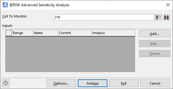Advanced Sensitivity Analysis allows for the selection of a number of @RISK distributions or worksheet cells in a model, which are then used in trial simulations that vary each of these inputs across a specified range. The Advanced Sensitivity Analysis command of the Simulate menu runs this analysis to determine the degree to which the selected inputs have an effect on an @RISK output. Unlike typical @RISK sensitivity analysis, the inputs analyzed can be either an @RISK distribution or a simple cell reference to a value or formula within an Excel workbook - an analyzed input does not need to contain an @RISK input distribution function. Advanced Sensitivity Analysis runs a full simulation at each of a set of possible values for each input, tracking the overall simulation results at each value. These results then show how simulation results changed as the input values changed.