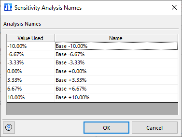When working with an Advanced Sensitivity Analysis simulation, the selected inputs are analyzed at various points, or "steps", along their possible values. For each step, a full simulation is run and the results of that simulation are stored. To aid in reporting and analysis, each of the steps of an input (or a group of inputs if multiple inputs are selected together) can be given a name. To add or edit the names for each analysis, click the Add Analysis Names button in the Input Definition window; the Sensitivity Analysis Names window (Figure 1, right) will open.