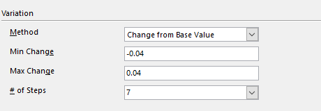 The first and the last value in the sequence to step through are obtained by adding or subtracting from the input's Base Value (set in the input's configuration - see Advanced Sensitivity Analysis). The Base Value is modified by the values specified in Min Change and Max Change entries. The intermediate values are at equal intervals, with the number of values to test set by # of Steps.