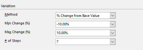 The first and the last value in the sequence to step through are obtained by incrementing, or decrementing, the input's Base Value (set in the input's configuration - see Advanced Sensitivity Analysis). The Base Value is modified by the percentages specified in Min Change (%) and Max Change (%) entries. The intermediate values are at equal intervals, with the number of values to test set by # of Steps.
