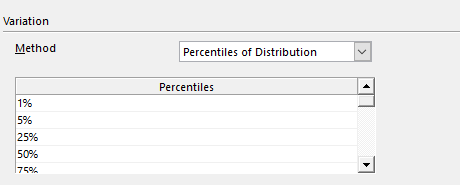 This Variation method is only available when the selected input Type is set to 'Distribution'. The sequence steps are specified as percentiles of the selected @RISK distribution; up to 20 steps can be defined.