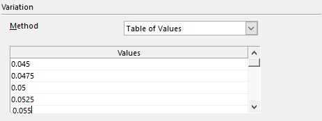 The Variation section in the Input Definition dialog configure the type of variation @RISK will use to select the test values for the input or inputs being added to the simulation. During an analysis, inputs are “stepped” across a range of possible values, with a full simulation run at each step value; the results of each of these simulations are then analyzed to determine the degree to which inputs have an effect on the output. The different Variation options provide a great deal of flexibility in describing how the input values will be tested.