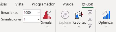 Cuando el complemento de @RISK se carga en Excel, la cinta de @RISK se añade a las pestañas de la parte superior de la ventana de la aplicación (Figura 1, derecha). La cinta de @RISK da acceso a todas las funciones de @RISK, y está organizada en secciones, de izquierda a derecha, siguiendo el proceso general de construcción de un modelo - Definir, Simular, Analizar.