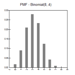 RiskBinomial(n, p) specifies a binomial distribution with parameters n and p. This is usually used to model the number of “successes” in n independent, identical trials, where p is the probability of success on each trial. For example, RiskBinomial(10,20%) represents the number of discoveries of oil from a portfolio of 10 prospects, where each prospect has a 20% chance of having oil. An important modelling application is when n=1, so that there are two possible outcomes (0 or 1), where the 1 has probability p, and the 0 has probability 1-p. (In this case, it is equivalent to the RiskBernoulli function with parameter p.) With p=0.5, it is equivalent to tossing a fair coin. For other values of p, the distribution can be used to model event risk, that is, the occurrence or nonoccurrence event, or to transform registers of risks into simulation models to aggregate the risks.