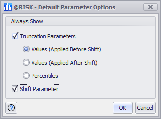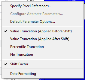 Several options for a distribution's parameters can be set through the Parameters menu (Figure 1, right). This includes which type of parameters to use (Standard or Alternate), truncation limits, shift factors, and date formatting for time-based distributions.