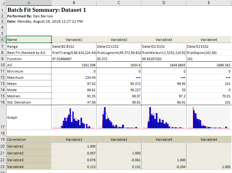 If 'Include Detailed Report Worksheet for Each Fit' is checked in the Results tab, @RISK will create a new worksheet for each data set included in the batch. Each worksheet will include the fit statistics generated for each distribution. These statistics include the recommended distribution function and parameters as well as a breakdown of how that distribution ranked when using each of the Best Fit Methods (ie. AIC, BIC, etc.) for each distribution function.