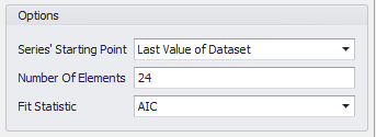 When a fit is run, but before anything is inserted into the worksheet, the Fit Time Series Results window will be displayed; from this window, a time series can be selected to insert into an @RISK worksheet. The Options panel of the Time Series Fitting and Time Series Batch Fitting windows (Figure 1, right) includes the configurations for the results of the fitting process. These options include the number of elements (i.e. the number of time periods) the model will include, as well as the Fit Statistic used to determine best fit for the time series models that are tested.