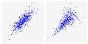 Much like a correlation matrix, a copula can be used to correlate two or more input distributions; however, there are key differences between using a correlation matrix and using a copula, and the outcomes can be significantly different. The primary difference exists in the pattern of samples returned by each distribution in relation to their correlated inputs. When using a correlation matrix, the pattern is always an "Elliptical Gaussian" pattern whereas a copula can utilize different shapes. Figure 1, right, demonstrates an example of the difference between the two.