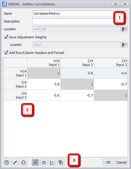 After inputs have been selected, or when editing an existing correlation, the Define Correlations window (Figure 3, below) will be displayed. The Define Correlations window allows for the configuration of correlations between two or more input distributions. By default, the window has three separate views, with a fourth added when Adjustment Weights are enabled (see Correlation Adjustment Weights for more information). Each view is accessed using the middle Command Buttons: