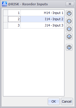 To move a row in the Reorder Inputs window, select it by clicking anywhere inside the row and then use the arrow buttons to the right of the window to move them. Click 'OK' to accept the order and return to the Define Correlations window.
