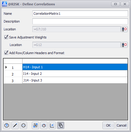 Multiple sets of input distributions can use the same correlation matrix to control the relationship between their sampled values; each set of inputs that utilizes a matrix is called an instance. The Instance Editor view (Figure 1, right) of the Define Correlations windows displays a table of all inputs and instances related to the correlation matrix being edited.