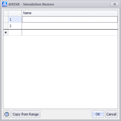 To copy simulation names from an Excel range, click the Copy from Range button and select the range that includes the simulation names. Please note: this process will only copy the values from the selected cells; simulation names will not dynamically update if the cell values change.