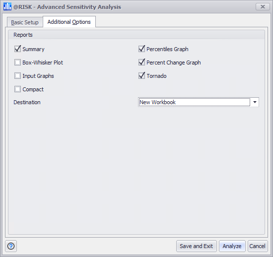 Additional configurations can be made to an Advanced Sensitivity Analysis simulation, including where the analysis reports will be placed. Click the Additional Options tab in the Advanced Sensitivity Analysis window to configure these options (Figure 1, right).