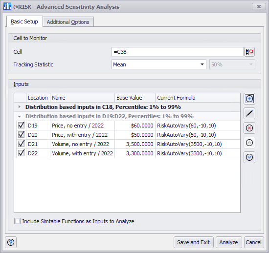 The Advanced Sensitivity Analysis window (Figure 1, right), consists of two tabs - Basic Setup and Additional Options. See Advanced Sensitivity Analysis Options for more information on the configurations available through the Additional Options tab.