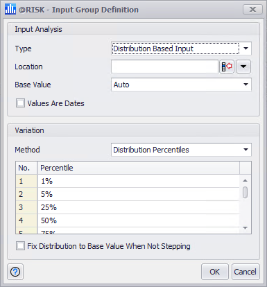 Analysis names relate to the variation method being used on the input. By default, the analysis name uses the variation method and degree of variation as the name, e.g. "Percentile %: 1%" for Distribution Percentile or "Base - 10.00%" for Percent Change from Base.