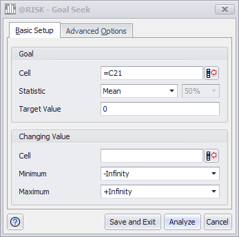 The Goal Seek window (Figure 1, right) consists of two tabs - the Basic Setup tab and Advanced Options tab. The Basic Setup tab contains the configurations required to run a Goal Seek analysis: