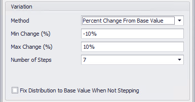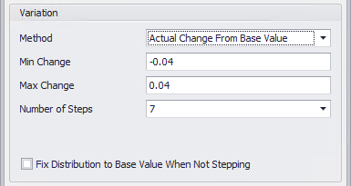 The first and the last value in the sequence to step through are obtained by adding or subtracting from the input's Base Value (set in the input's configuration - see Advanced Sensitivity Analysis). The Base Value is modified by the values specified in Min Change and Max Change entries. The intermediate values are at equal intervals, with the number of values to test set by Number of Steps.