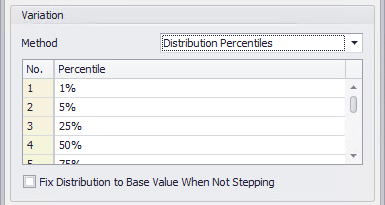 This Variation method is only available when the selected input Type is set to 'Distribution'. The sequence steps are specified as percentiles of the selected @RISK distribution; up to 20 steps can be defined.