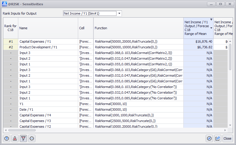 The Sensitivities command in the Explore Menu opens the Sensitivities window (Figure 1, right) which displays sensitivity analysis results for outputs in an @RISK model. Sensitivity analysis shows a ranked list of the inputs that have the greatest effect on the selected output. There are several methods of analysis available for ranking the impact of inputs on the selected output, including change in output statistic, regression, and contribution to variance that are available through the Settings/Actions menu.