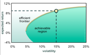 The graph at right (Figure 1) illustrates an efficient frontier, the yellow curve. Optimal portfolios can be found for any point on this curve, and these are the only portfolios an investor should consider. Points in the darker green area below and to the right of the efficient frontier correspond to portfolios that have more risk than necessary for any specified expected return, so they are suboptimal and shouldn’t be considered. Points in the lighter green area above and to the left of the efficient frontier are impossible to achieve.