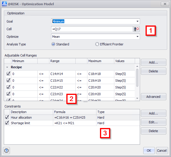The Model Definition window (Figure 1, below) provides an interface for defining a RISKOptimizer model, including its objectives, adjustable cells, and constraints.