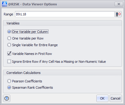 • Variable Names in First Row/Column - If the first row or column contains the names of the variables in the data set, check this option. @RISK will try to detect this automatically, but it can be set manually if necessary.
