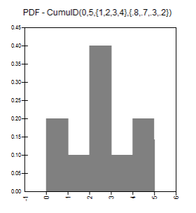 RiskCumulD(minimum,maximum,{X1,X2,..,Xn},{p1,p2,..,pn}) specifies a cumulative distribution with n points. The range of the cumulative curve is set by the minimum and maximum arguments. Each point on the cumulative curve has a value X and a probability p. Points on the cumulative curve are specified with increasing value and decreasing probability. Each probability entered is a cumulative descending probability, that is, the probability of a value greater than the entered X value. Any number of points may be specified for the curve. Note that even though the X,p pairs “define” the distribution, any value between minimum and maximum can be returned.