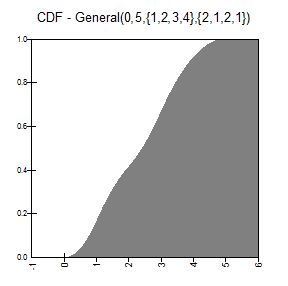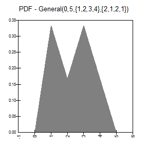 RiskGeneral(minimum,maximum,{X1,X2,...,Xn},{p1,p2,...,pn}) specifies a generalized probability distribution defined by a density curve specified at n points. Each point has a value X and a probability weight p that specifies the relative height of the density curve at that X value. The probability weights can sum to any value, but internally, @RISK normalizes them so that they sum to 1.