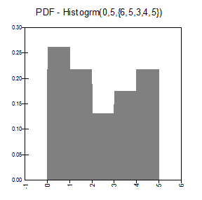 RiskHistogrm(minimum, maximum, {p1,p2,...,pn}) specifies a user-defined histogram distribution with a range defined by the specified minimum and maximum values. This range is divided into n classes. Each class has a weight p reflecting the probability of occurrence of a value within the class. These weights can be any nonnegative values to indicate relative likelihoods, but @RISK will normalize them so that they sum to 1.