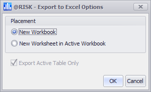 Most @RISK graphs can be exported to files, the clipboard, or to native Excel charts. To access graph exporting options, either click the Export button which will be in the bottom right corner of the window containing the graph, or right-click on the graph itself.