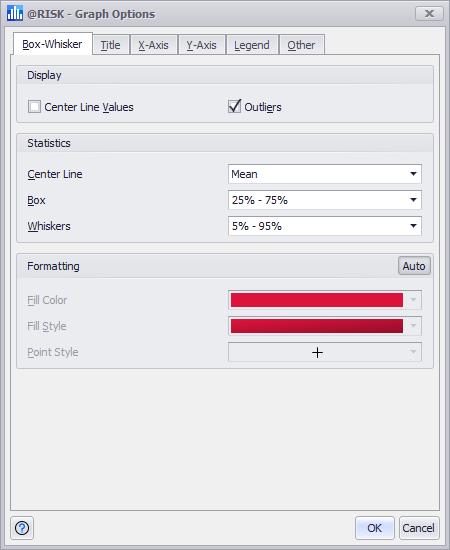 Fill Color and Fill Style determine the color and pattern of the box components; Point Style controls the shape of the outlier data points. Outliers use the Fill Color value.