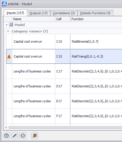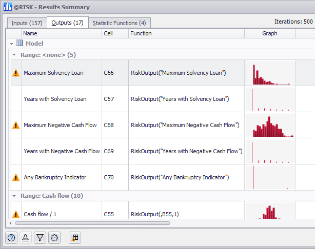 The Results Summary Window displays warning icons for inputs with errors identical to the Model List window. However, unlike the Model List window, the Results Summary window also displays warning icons for both @RISK outputs and @RISK statistic functions that have errors, either because they they utilize or rely on an @RISK input that has been configured incorrectly or because they are misconfigured themselves.