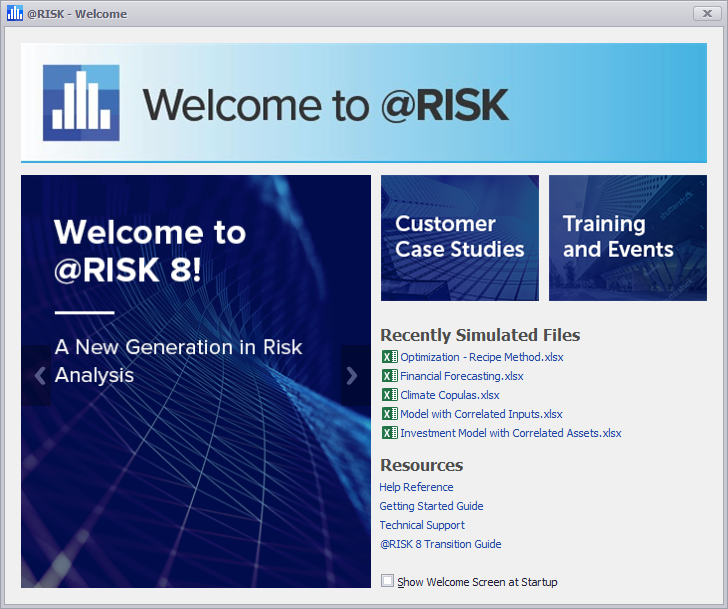 The first time @RISK is started, the Welcome screen will open. The Welcome screen can also be opened manually from the @RISK Menu. The Welcome screen includes up-to-date news and announcements as well as several key shortcuts.