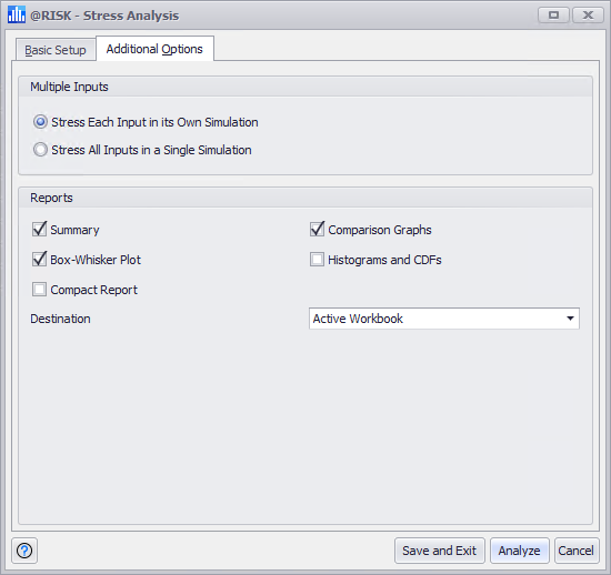 Further configurations can be made for a Stress Analysis simulation, including how inputs will be stressed, what components to include in the results, and where the Stress Analysis reports will be placed. Click the Options button in the Stress Analysis window to open the Stress Options window (Figure 1, right).