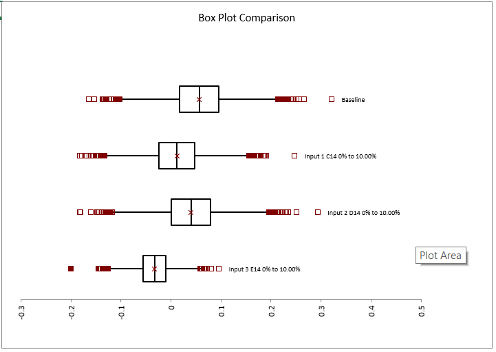 This graph displays a boxplot of both the baseline and each of the stressed inputs. A box plot displays the summary of a set of data for five statistics - the minimum, first quartile, median, third quartile, and maximum. The box spans the first quartile to the third quartile and a vertical line marks the median.