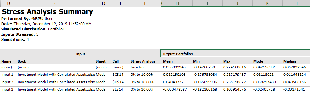 The Histogram option creates a histogram for both the baseline and each of the stressed inputs, adding all graphs to the same worksheet.